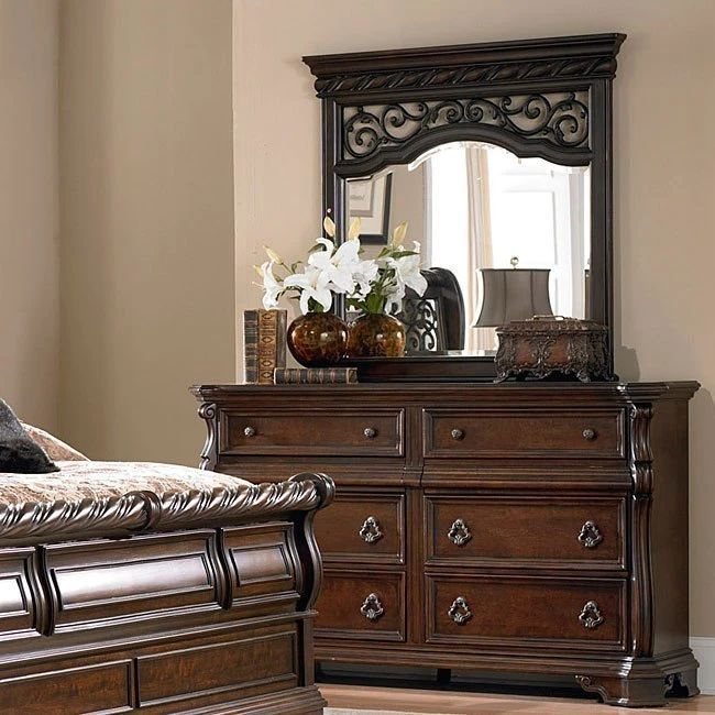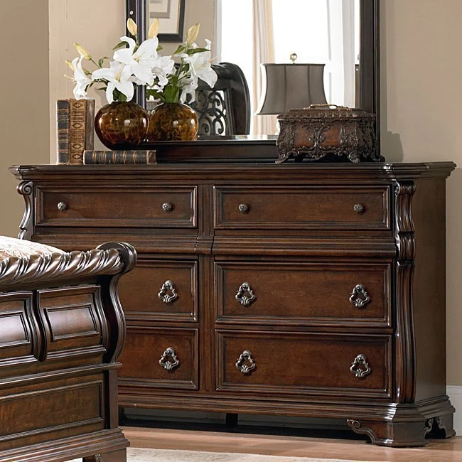 - OverviewThe Arbor Place Bedroom Collection by Liberty Furniture bridges the boundary between formal and casual, elegant and relaxed, classic and fresh. A combination of bold and dramatic scaling with soft shapes creates a casual traditional style. The Arbor Place crafted from poplar solids and birch veneers. A nice feature is the center hidden drawer disguised as a center step molding. Attention to detail is noted in the carved accents and custom designed drop ring and knob hardware. The double dresser features fancy face 4 way match veneer top, full extension metal side drawer glides, English dovetail construction, felt lined top drawers, fully stained interior drawers, felt lined hidden drawers, bottom case dust proofing and scrolled bracket feet. From the classic brownstone finish to the elegant details, this collection is certain to become a standout item in your bedroom.