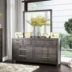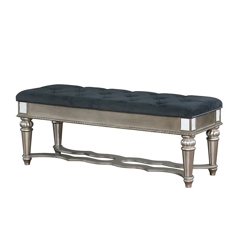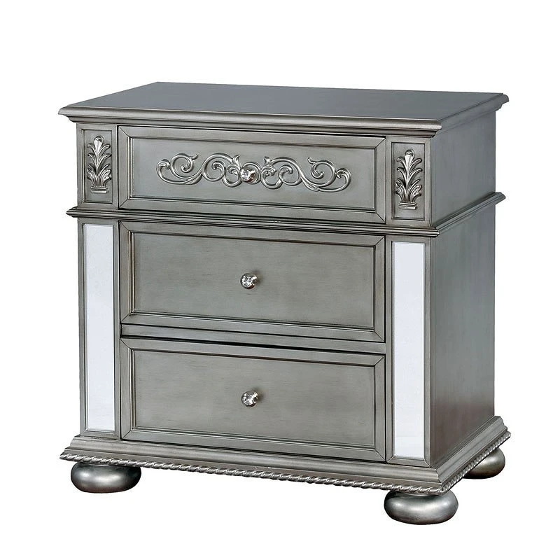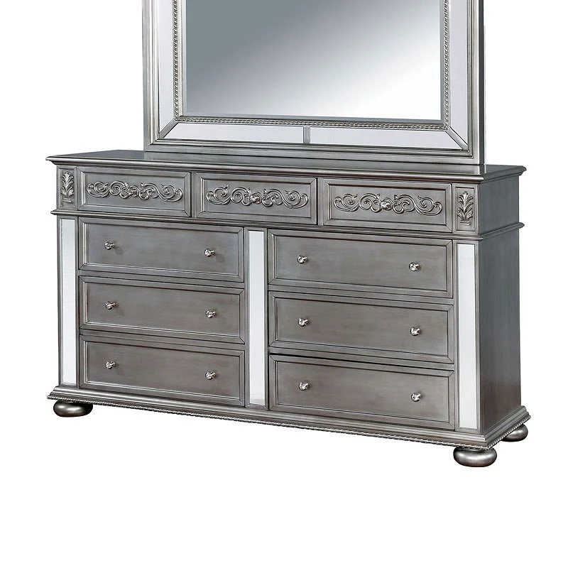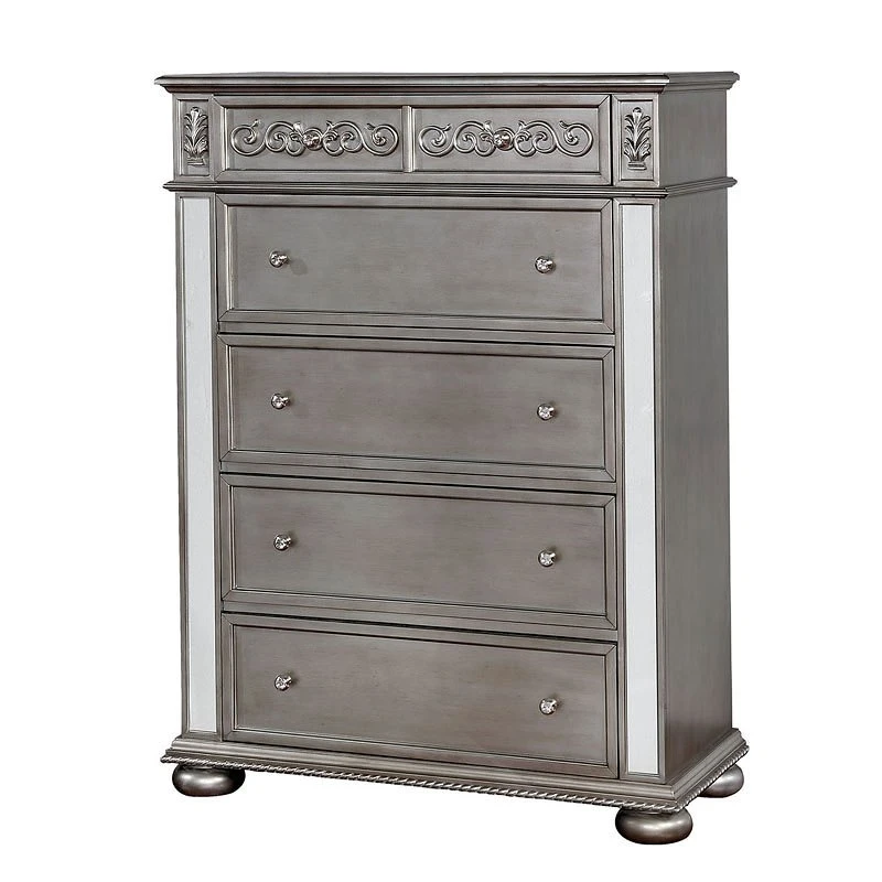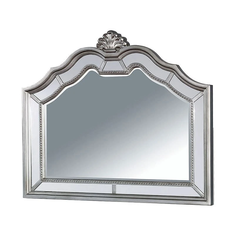 - OverviewLavishly update with this stunning Azha Bedroom Collection by Furniture of America. The high back bed creates a glamorous focal point with its rounded finials, smooth arches and tufted details. Case goods shine as mirrored accents glimmer against the silver finished set. Sculpted accents embellish with floral patterning, completing the set with rich styling.