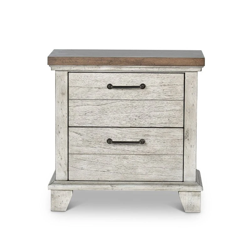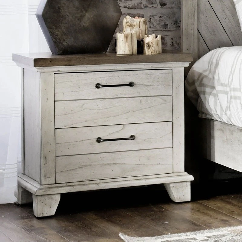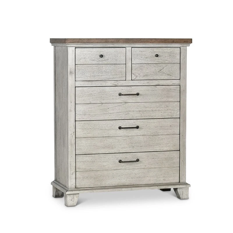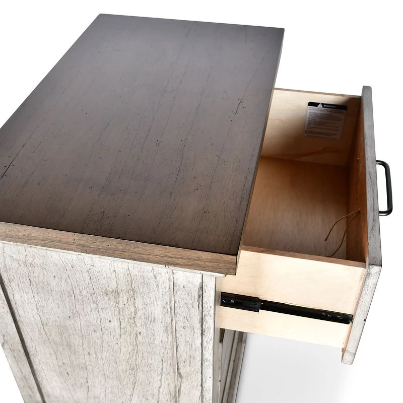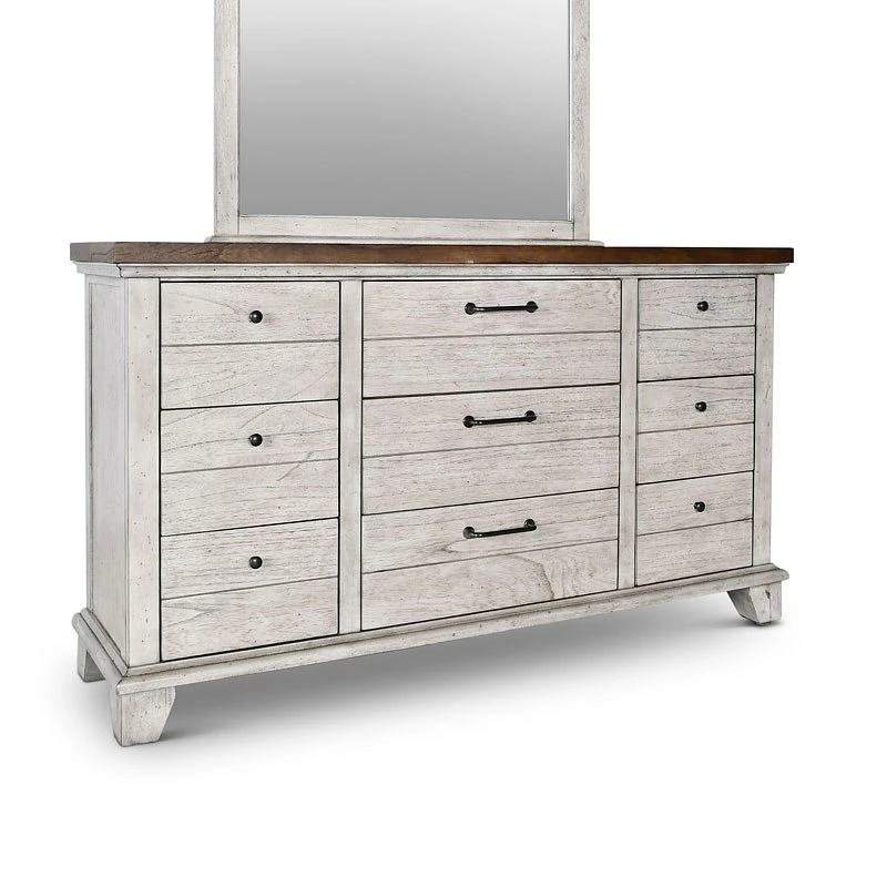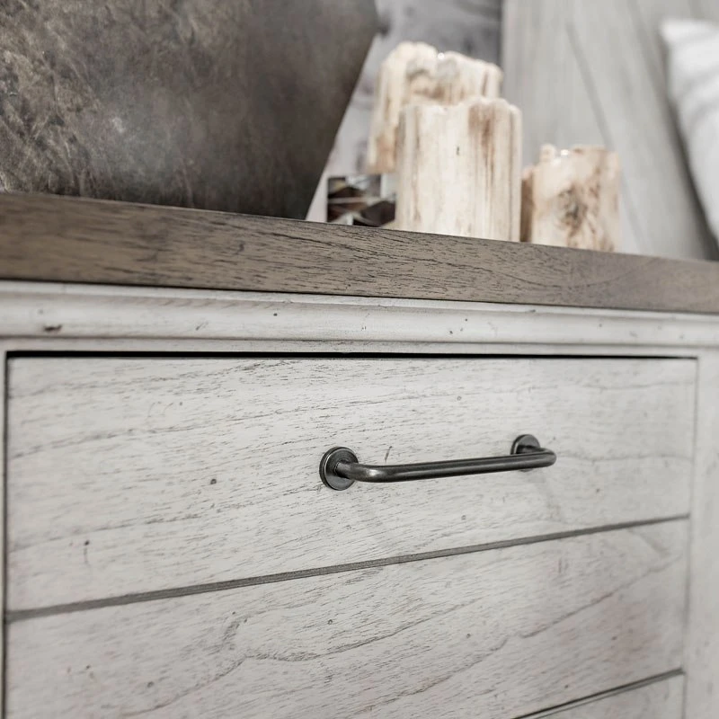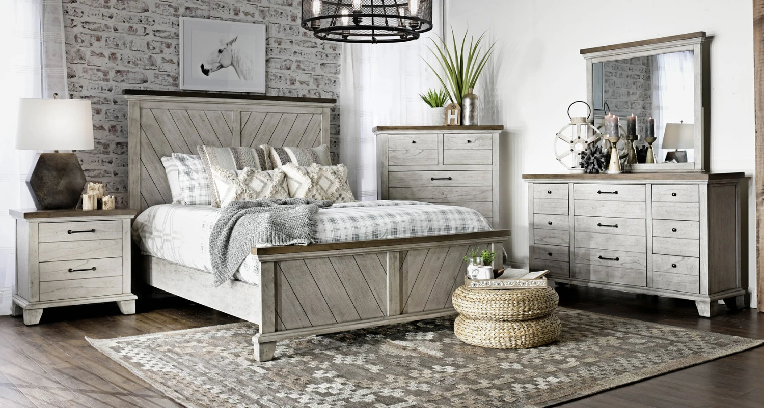 - OverviewA rustic, farmhouse-inspired bedroom, Bear Creek Bedroom Collection by Steve Silver Furniture features a white-smoke finish that contrasts beautifully with honey-smoke stained tops and cap rails. The bed features chevron-patterned headboard and footboard. The bedroom collection offers a variety of storage items with ultra-deep drawers supported by side drawer glides for easy operation.