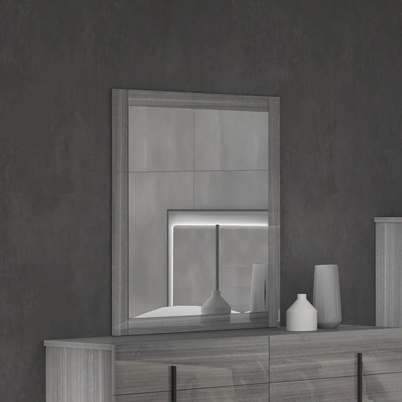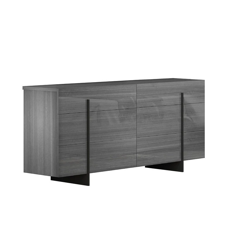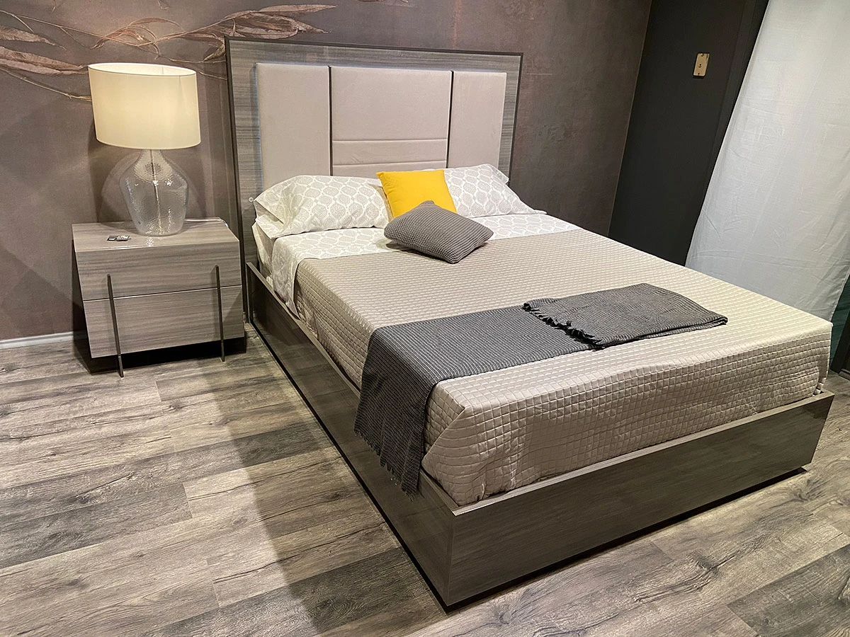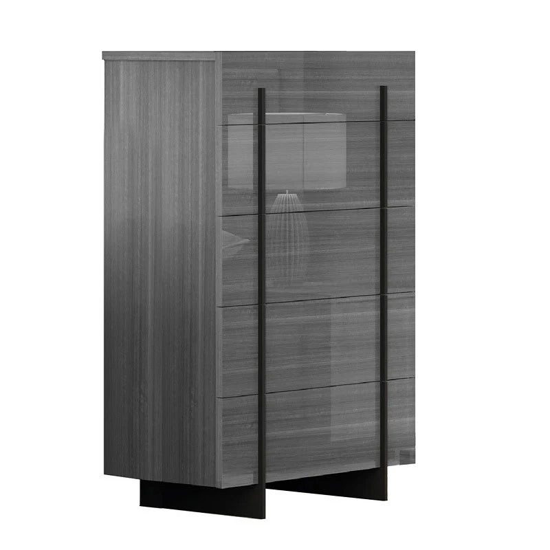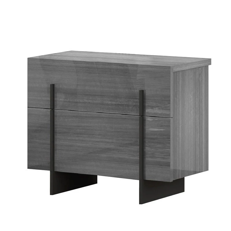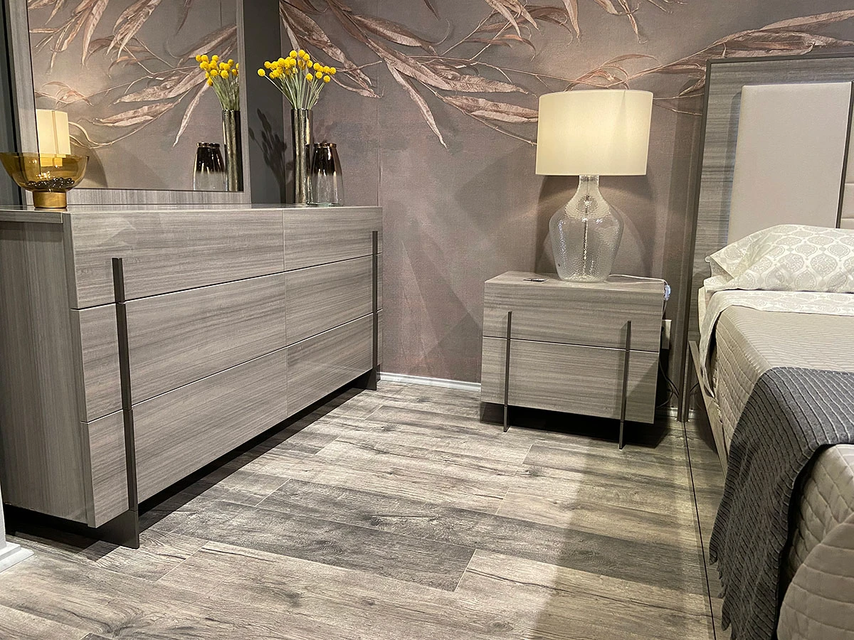 - OverviewThe Blade Premium Bedroom Collection by J&M Furniture showcases an innovative and luxurious design created by the metal “blades” that start underneath the case goods and extend to the front to serve as handle for the drawers. The design is replicated on the headboard where two metal bars sink into a velvety upholstered panel. Hidden behind the edges of the panel there is a stripe of led lights that serve as courtesy lights operated by invisible switches located on each side of the headboard. These panels feature eucalyptus grain black stripes over a grey color with a glossy finish. This sophisticated modern-industrial design is a great addition to the furnishing of your house.