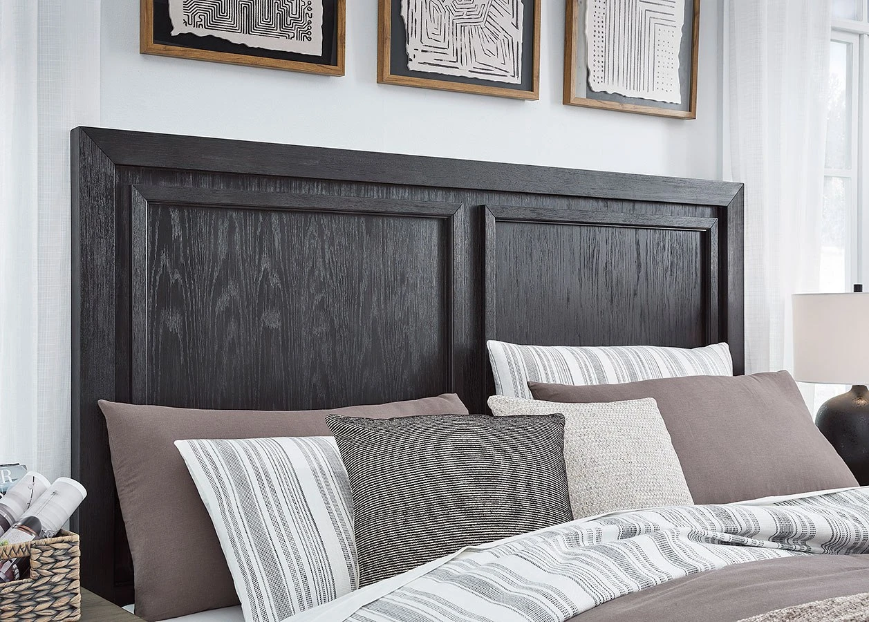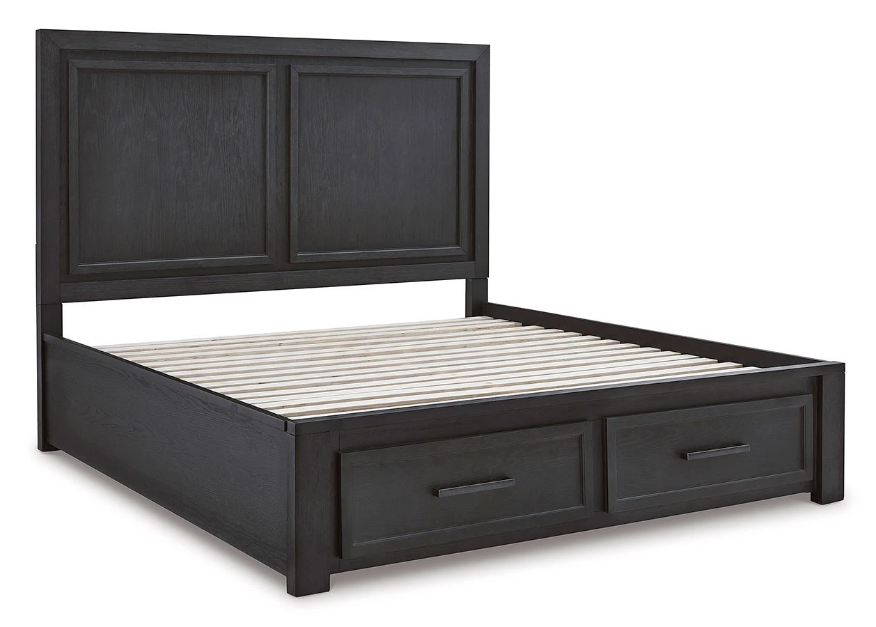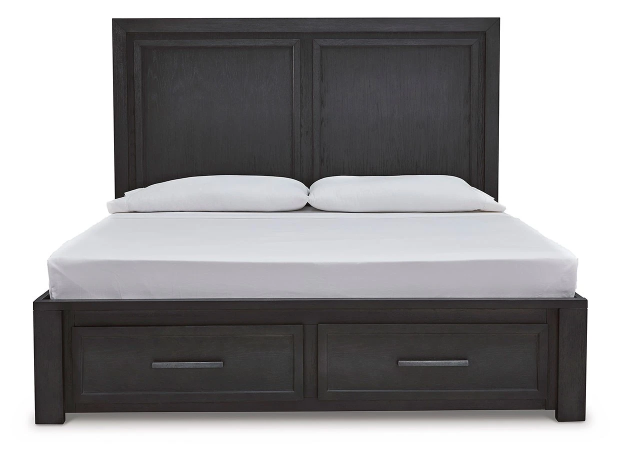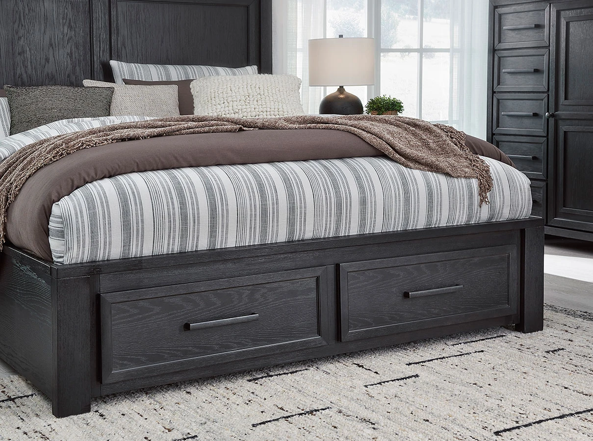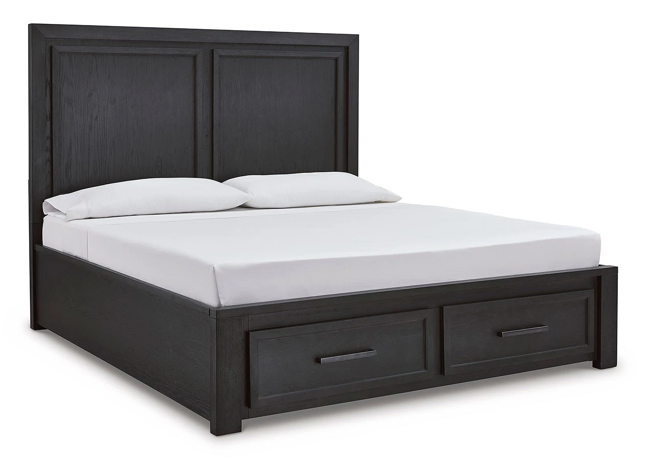 - OverviewThis Foyland Storage Bed by Signature Design is casual style simply done right. Its brushed black finish and picture frame headboard provide just the right touch of contemporary charm. Two deep storage drawers generously accommodate your wardrobe needs with ease.