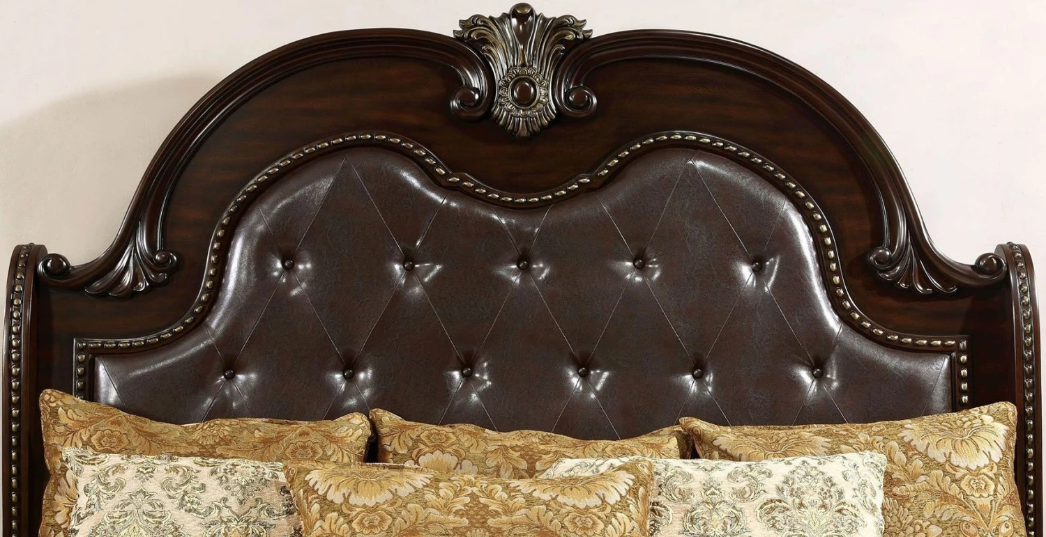 - OverviewThe bold look of the Fromberg Bedroom Collection by Furniture of America boasts an elegantly traditional design. A tall camelback headboard with button tufted leatherette upholstery is in the perfect contrast to the sleigh style footboard.