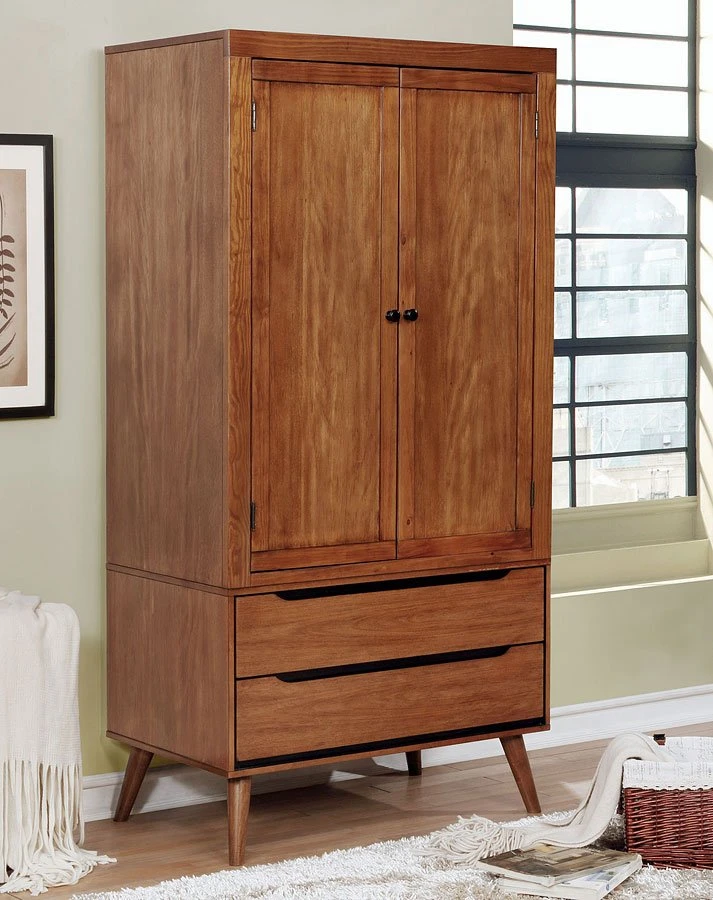 - OverviewFor a quick modern update to your home, the Lennart Bedroom Collection by Furniture of America will add that trendy mid-century appeal. Coordinating case goods such as this armoire boast slim flared legs and plenty of storage.