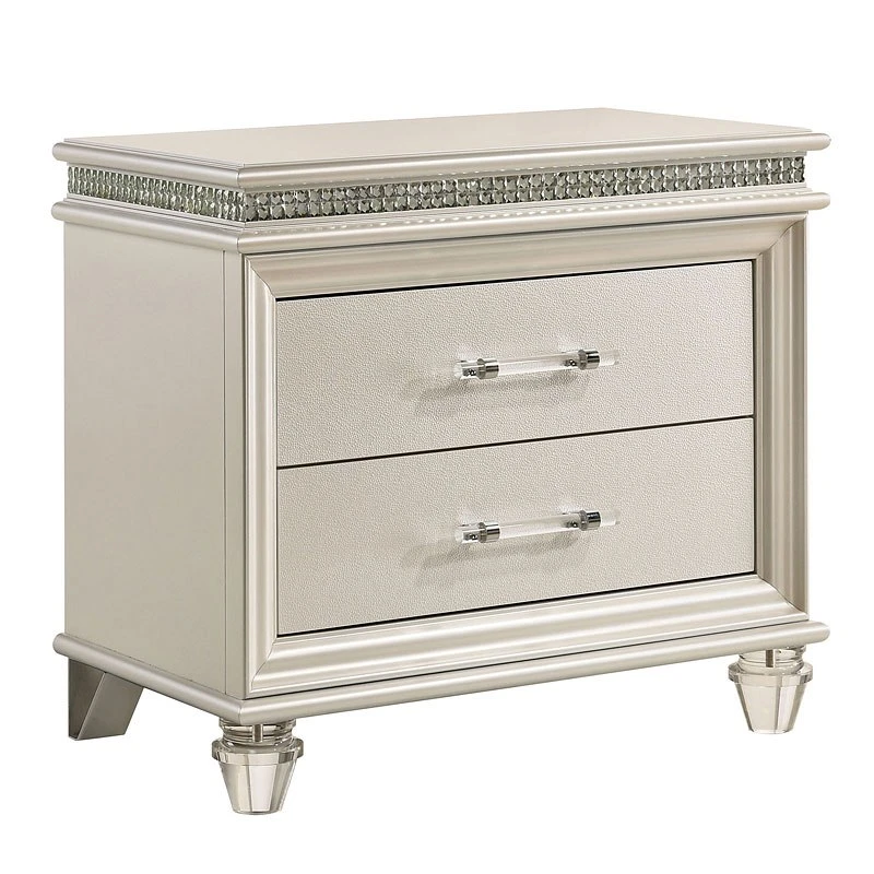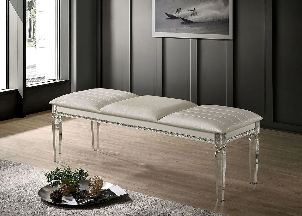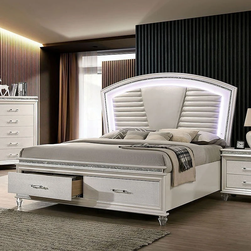 - OverviewCreate a room made for a princess with this Maddie Bedroom Collection by Furniture of America. The curved headboard is padded and upholstered in a horizontally-tufted leatherette, emphasizing the pearl white finish. The casegoods feature acrylic legs, crystal accents, and a beveled mirror with a LED light creating a glamorous aesthetic. Give into your glitzy side with this opulent set.