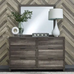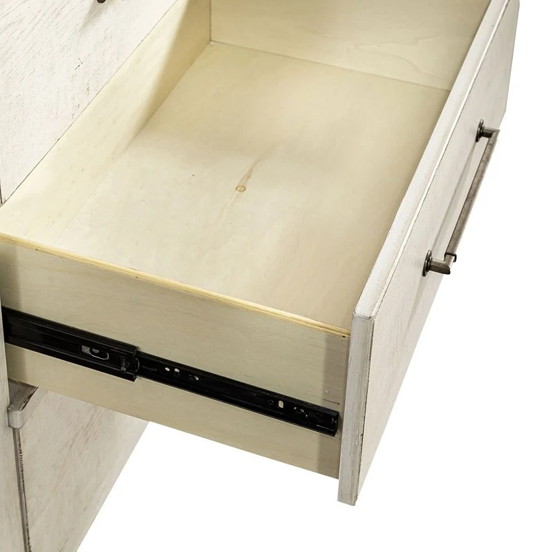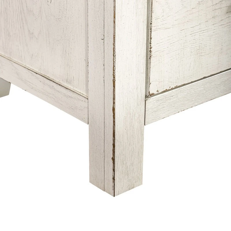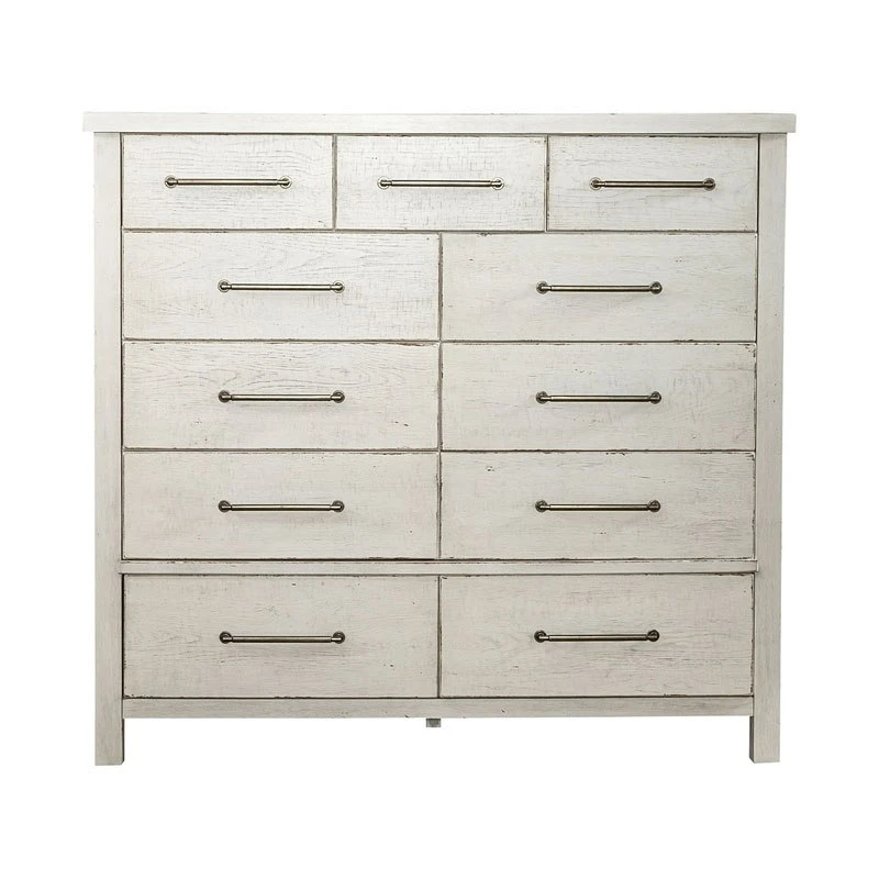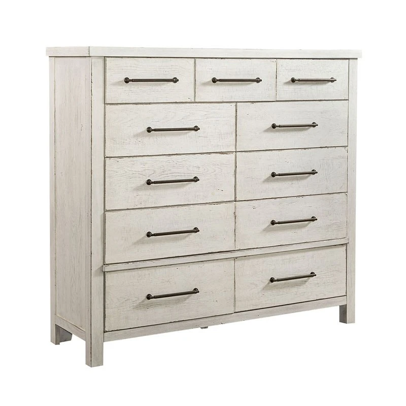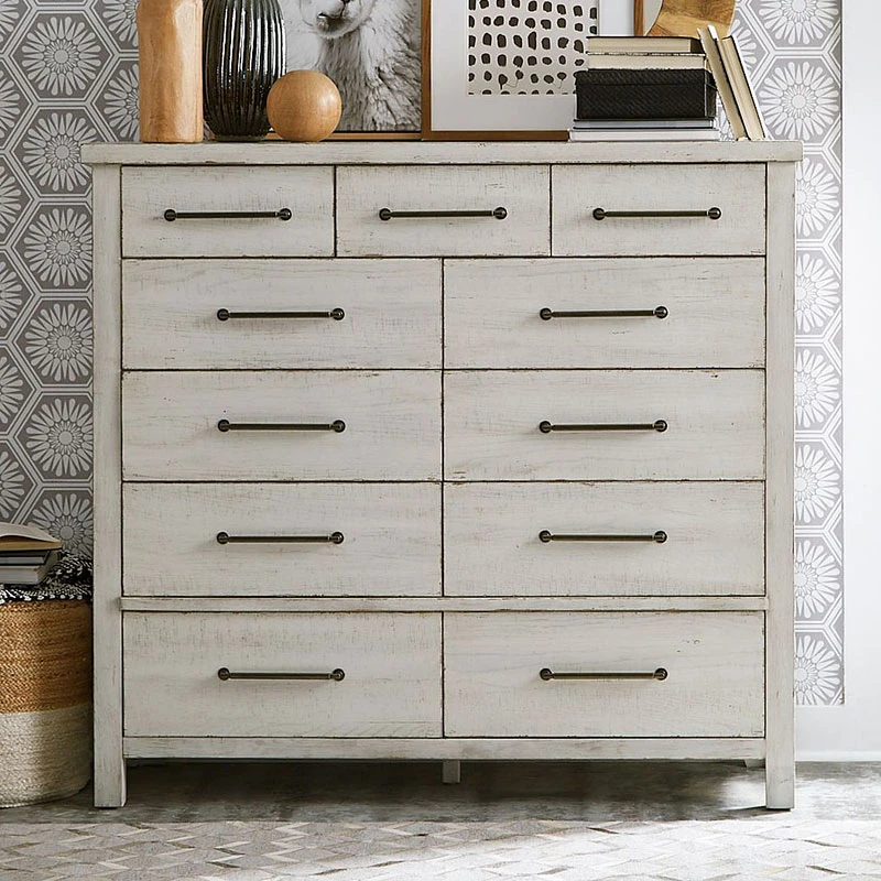 - OverviewCreate an inviting space with the Modern Farmhouse Chesser by Liberty Furniture. Crafted of poplar solids and knotty white oak veneers, this piece features a flea market white finish with heavy distressing, eleven drawers of storage that include three smaller drawers across the top of the case that still offer plenty of deep storage, flat front full extension drawers with premium felt-lined top and cedar-lined bottom drawers, and is accented with washed brass elongated bar pull hardware. Inviting and Inspirational the Farmhouse look is a design style that works cottage or contemporary, it is more about creating a look that we love.