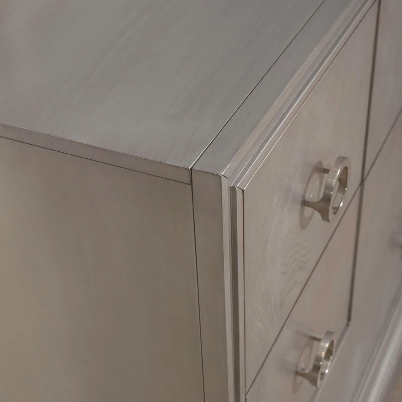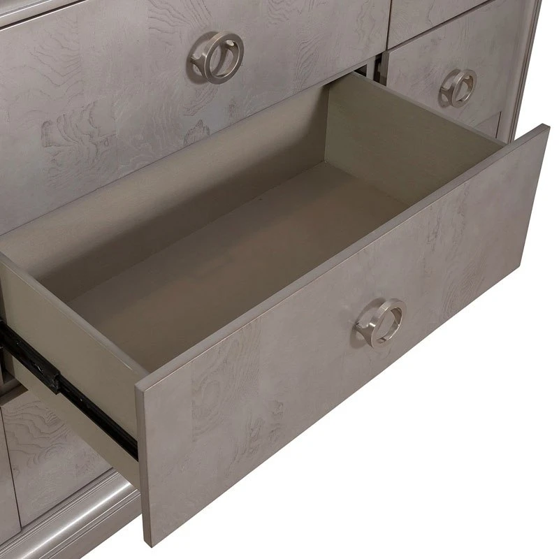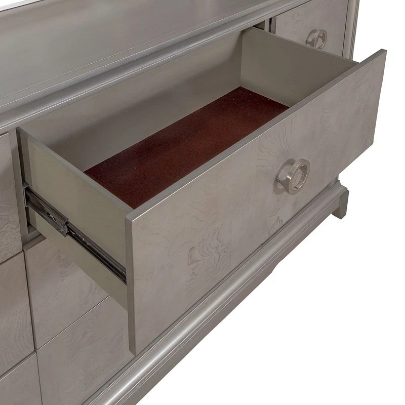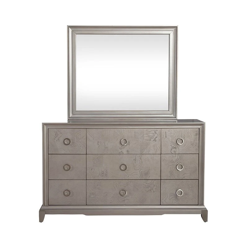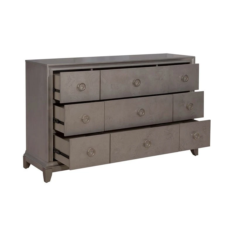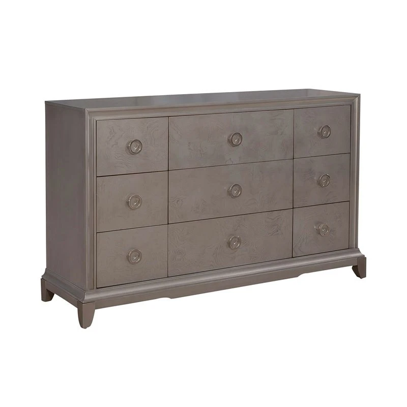- OverviewLuxe living is highlighted by a design that conveys luxury and sophistication. Choose the Montage Dresser by Liberty Furniture to achieve just that. Crafted of poplar solids with birch and ash burl veneers, this piece features a platinum finish with brushed satin nickel ring hardware. The dresser has nine full extension drawers with the top drawers being lined in premium felt and cedar-lined bottom drawers. The cove picture frame molding and offset apron flow into saber feet. Reinvent your style with the Montage Collection.