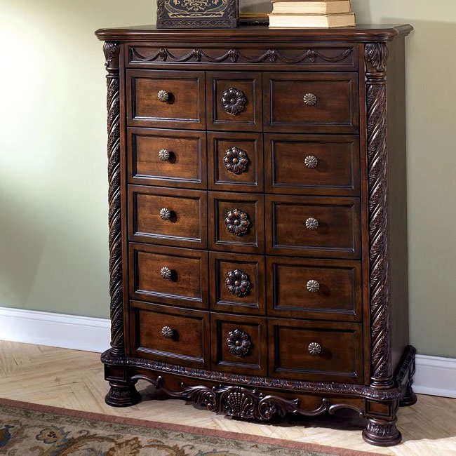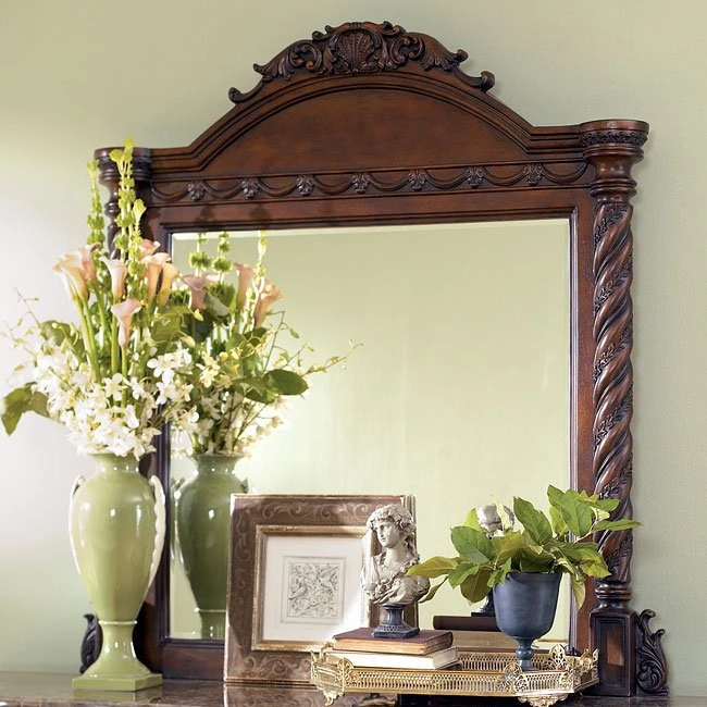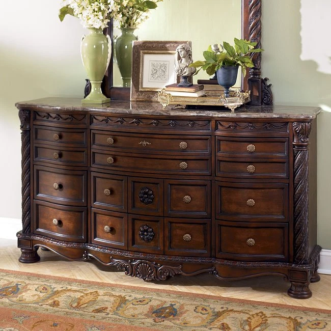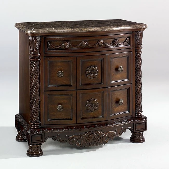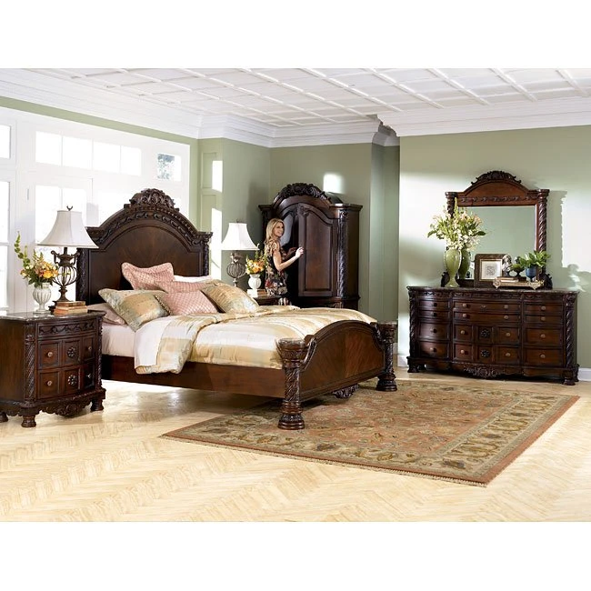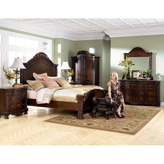 - OverviewNorth Shore Panel Bed in Dark Wood with Nightstand, Dresser, Mirror. A rich traditional design and exquisite details come together to create the ultimate in the grand style of the North Shore Bedroom Collection. The opulent brown color flows beautifully over the decorative pilasters and ornate detailed appliques to create a rich elegant atmosphere to any home environment. With a serpentine shaped design and inlay stone veneer tops, this furniture collection takes traditional style to the next level. Transform your bedroom with the rich style of the “North Shore” bedroom collection.