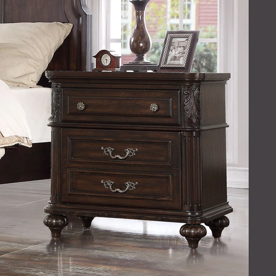 - OverviewElegant, yet casual, Nottingham Collection by Bernards Furniture features classic English style elements of soft carvings, framed drawer fronts, and bun feet. Finish is black cherry with distressed with faux cowtails, worm holes and knife marks.