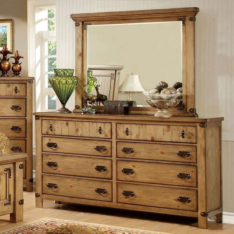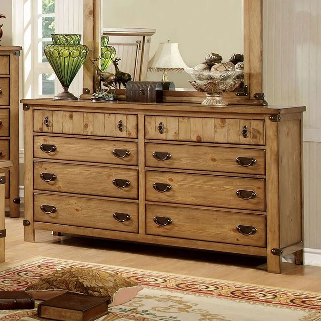- OverviewThis classic old-fashioned Pioneer Panel Bedroom Collection by Furniture of America wears a weathered elm finish with natural wood accents. The case goods have matching hardware and decorative metal hinges and transforming any bedroom into a timeless living area.