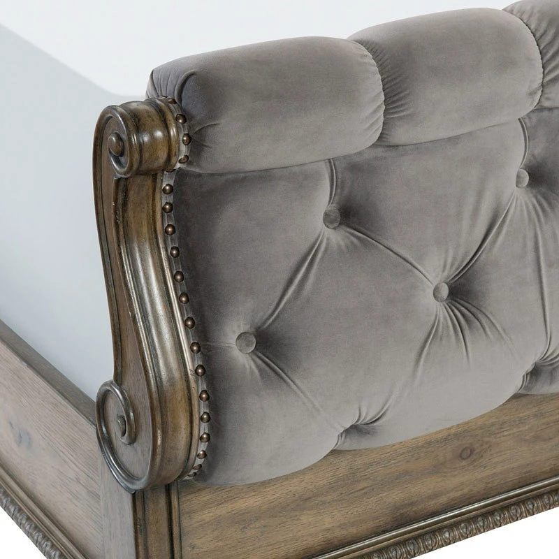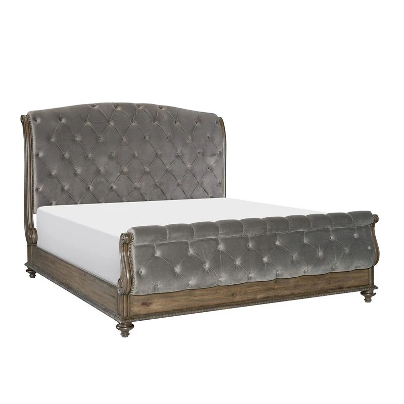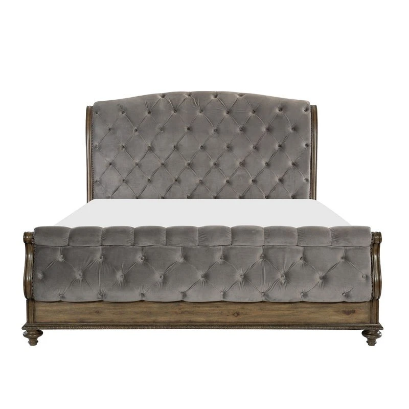 - OverviewThe balance of rusticated accenting and elegant form is exquisitely achieved in the design of the Rachelle Bedroom Collection by Homelegance. Serving as the focal point of the collection the stately sleigh bed presents an elegant profile for your bedroom, with its gray velvet-covered, rolled, padded headboard and footboard defined by button tufting, nailhead accent and wood framing. The traditionally styled case pieces feature classic appointments such as turned feet, brown-finished metal drop hardware, egg and dart molding, and rounded pilasters. The knotty pecan wood veneer features a weathered pecan finish further lending to the classic look of the collection.