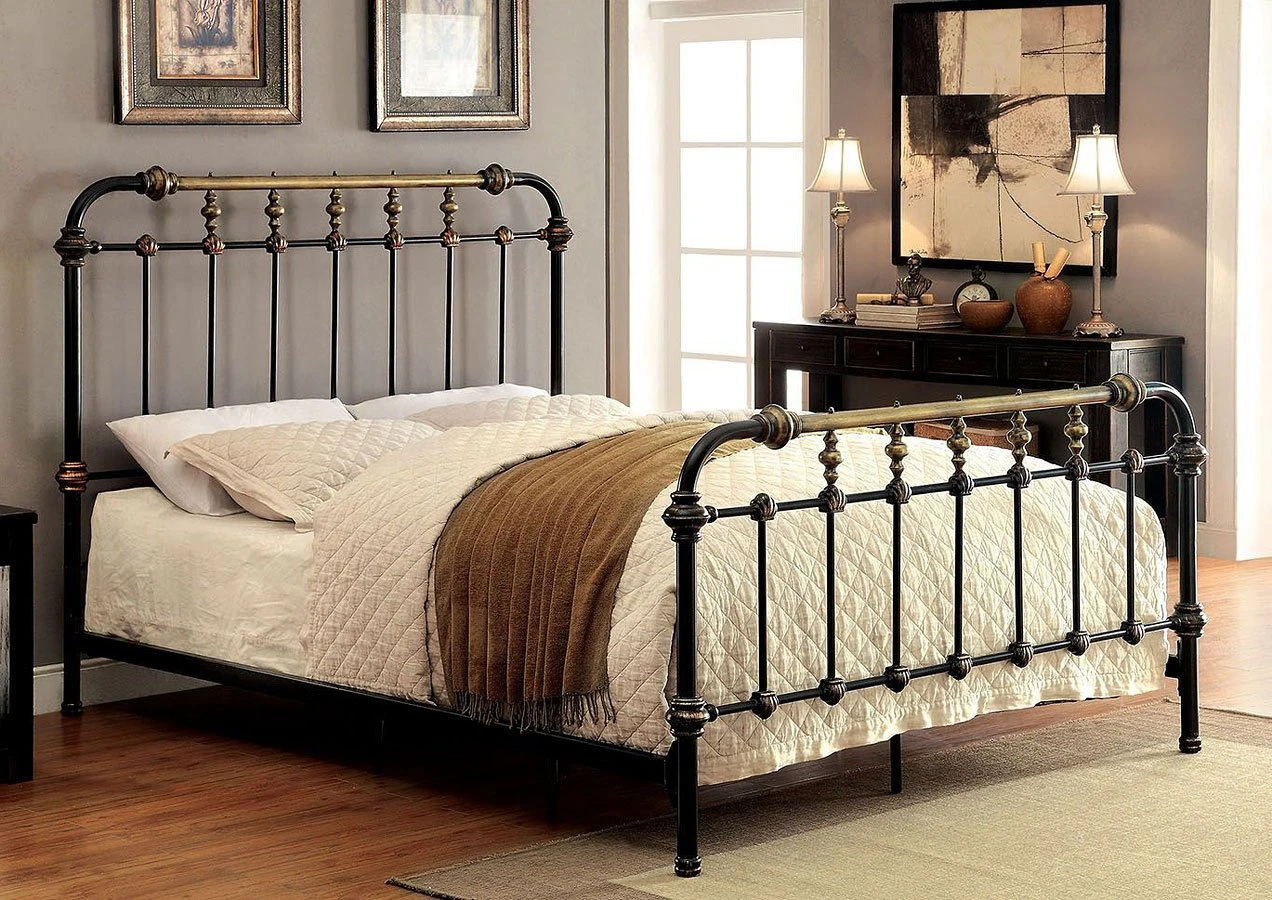 - OverviewIf you are drawn to works of art or unique fixtures, this one-of-a-kind Riana Bed by Furniture of America is fit for your home. The antique coloring brushed along the ornamental accents creates an unusual atmosphere that accentuates the full metal construction. Entirely finished in powder coated black, this bed is appropriate for any bedroom setting.