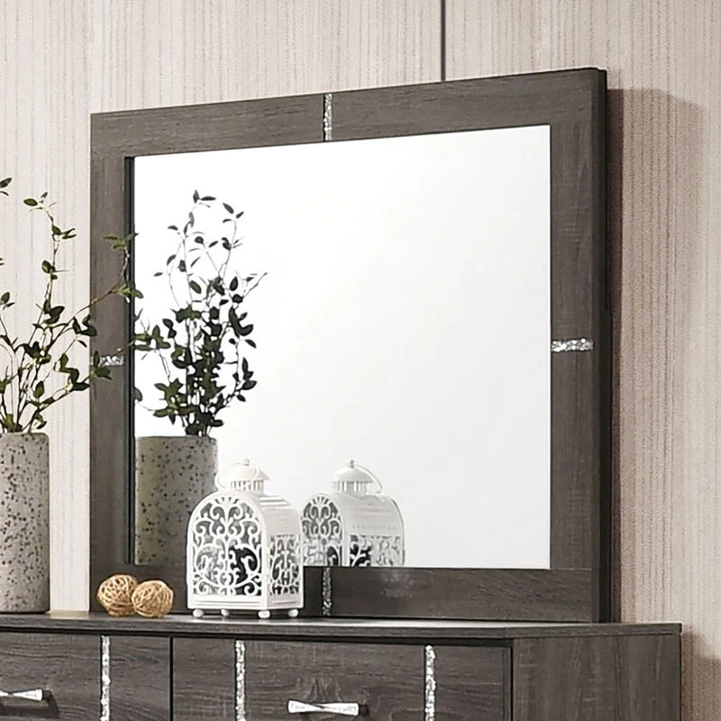 - OverviewHere’s Richterswil mirror by Furniture of America that definitely warrants a second look. The edge panels are simple and bold featuring a warm gray finish. Upon closer inspection, however, you’ll notice the shimmering glitter- encrusted gaps. Running across the planks in multiple spots, these gaps feature stark contrast between wood and acrylic. Combined with the straight edges, you have one beautiful piece that brings a sense of modernity and glamour at the same time.
