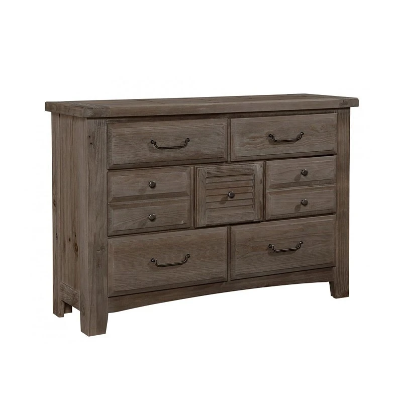 - OverviewThe Rustic style of the Sawmill Bedroom Collection by Vaughan-Bassett meets pure function with natural and hand distressed finishing techniques that add unique aesthetic design detail to each piece. The antiqued pewter finished hardware combination of knobs and elongated pulls compliments the vintage styling.