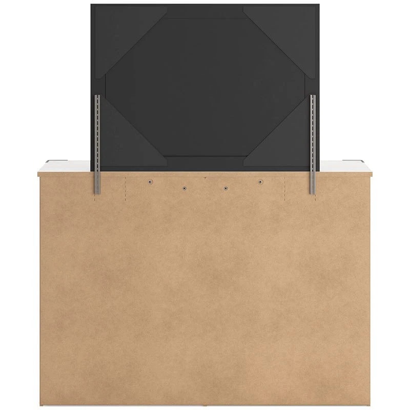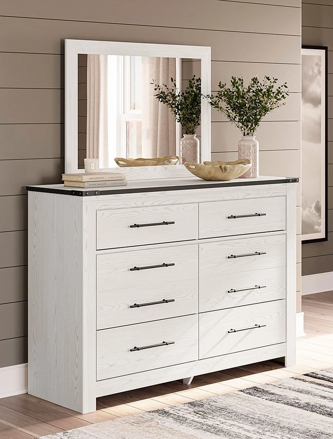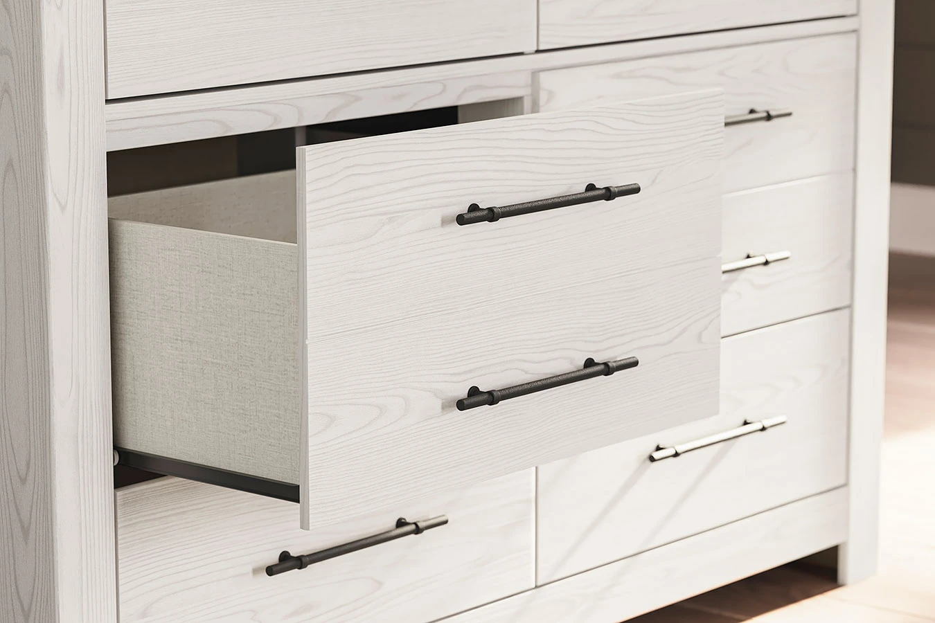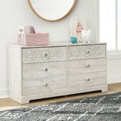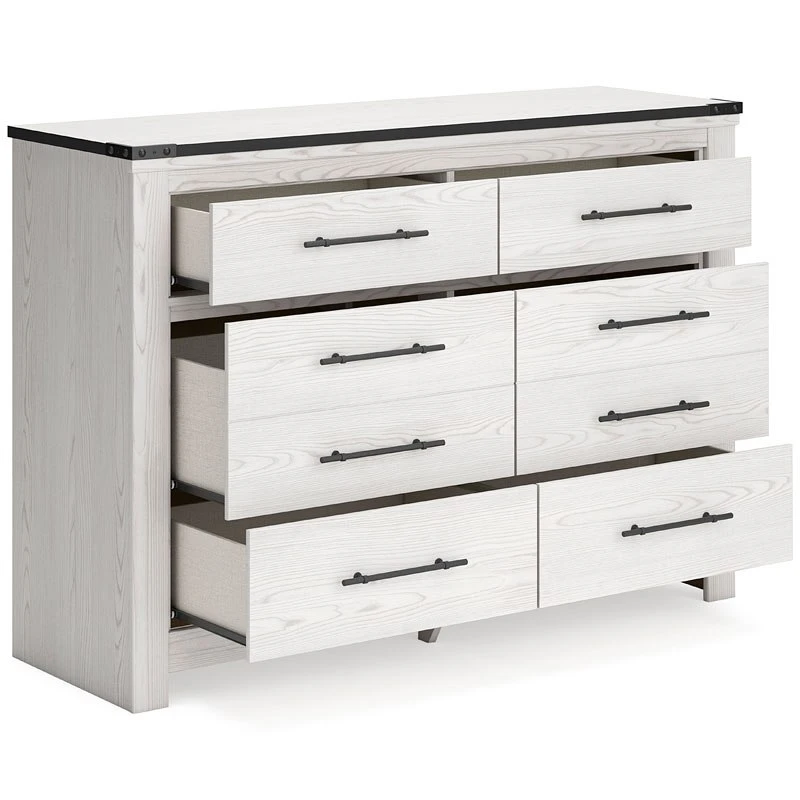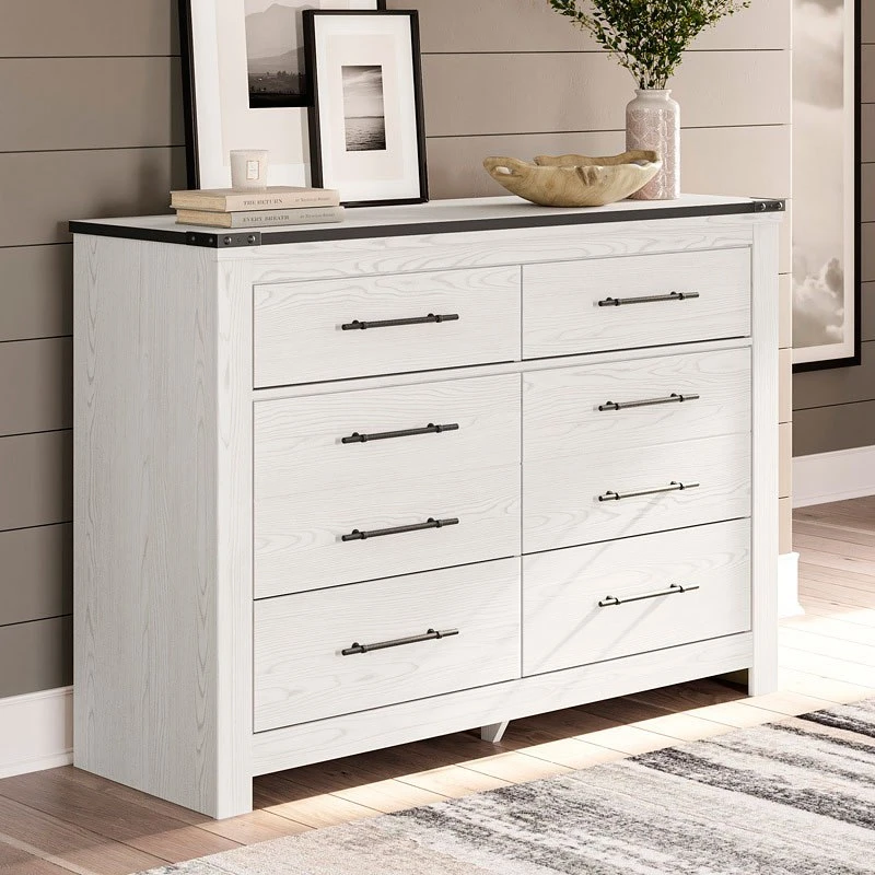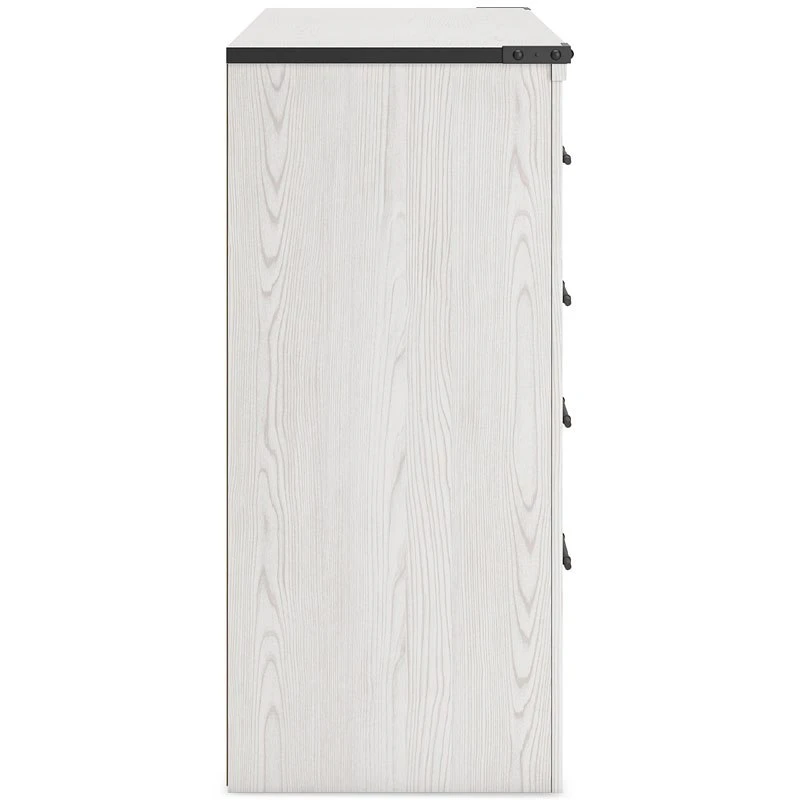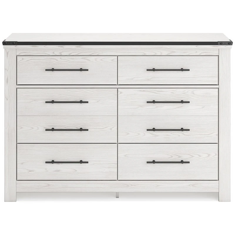 - OverviewThis Schoenberg dresser by Signature Design harmonizes effortlessly with your farmhouse-chic approach to contemporary style. Curate your space with the charmingly classic look of its white rustic finish, with sleek dark pewter-tone handles adding a modern touch. Faux metal banding and nailhead corner accents infuse the clean-lined design with delightful vintage character.