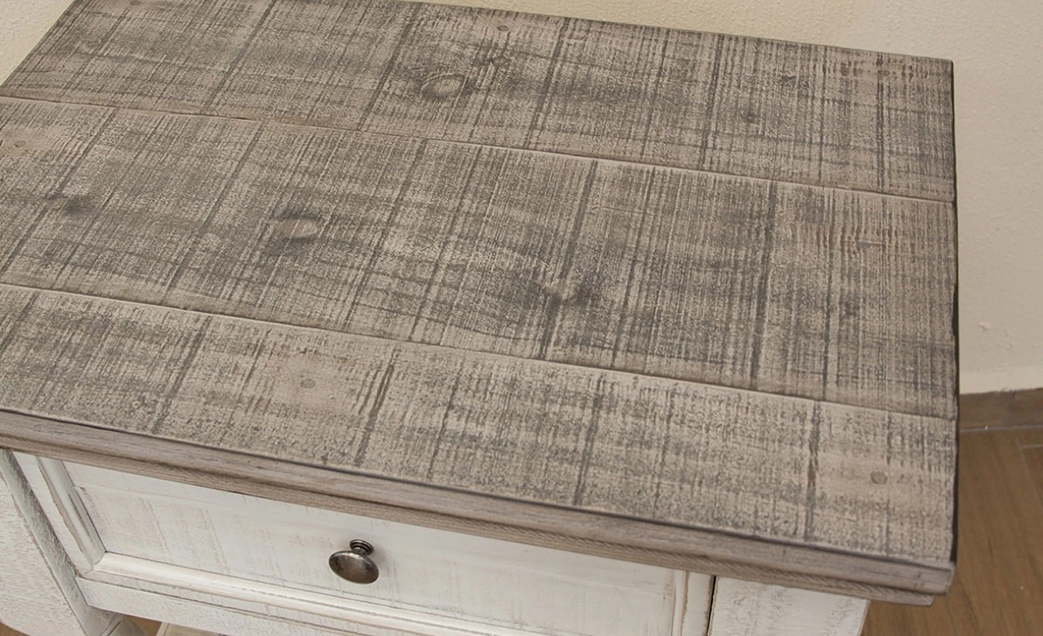 Tops feature weathered gray finish on hand – distressed wood and eggshell antiqued finish on the rest of the case pieces