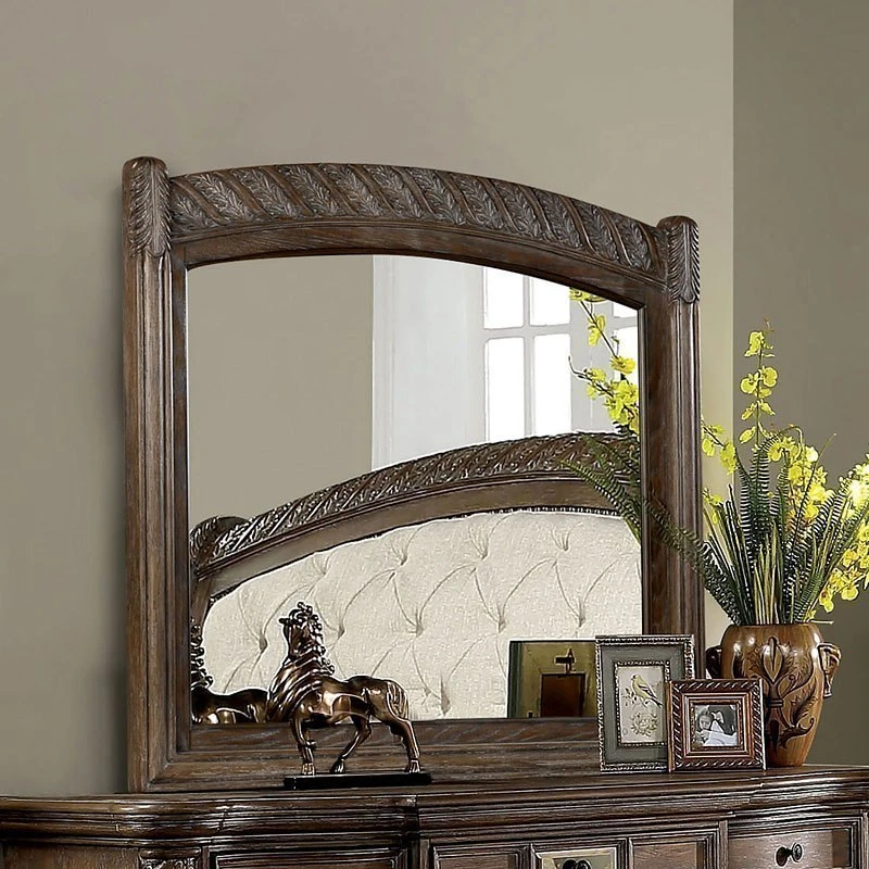 - OverviewThere’s something magnificent about home decor with transitional styling; this Timandra mirror by Furniture of America is a perfect example. The floral and rope faux wood details are borrowed elements from traditional pieces, while the rustic natural tone finish brings warmth to any room.
