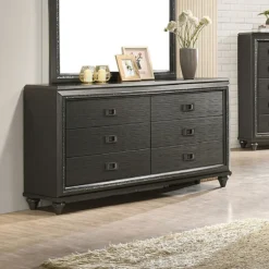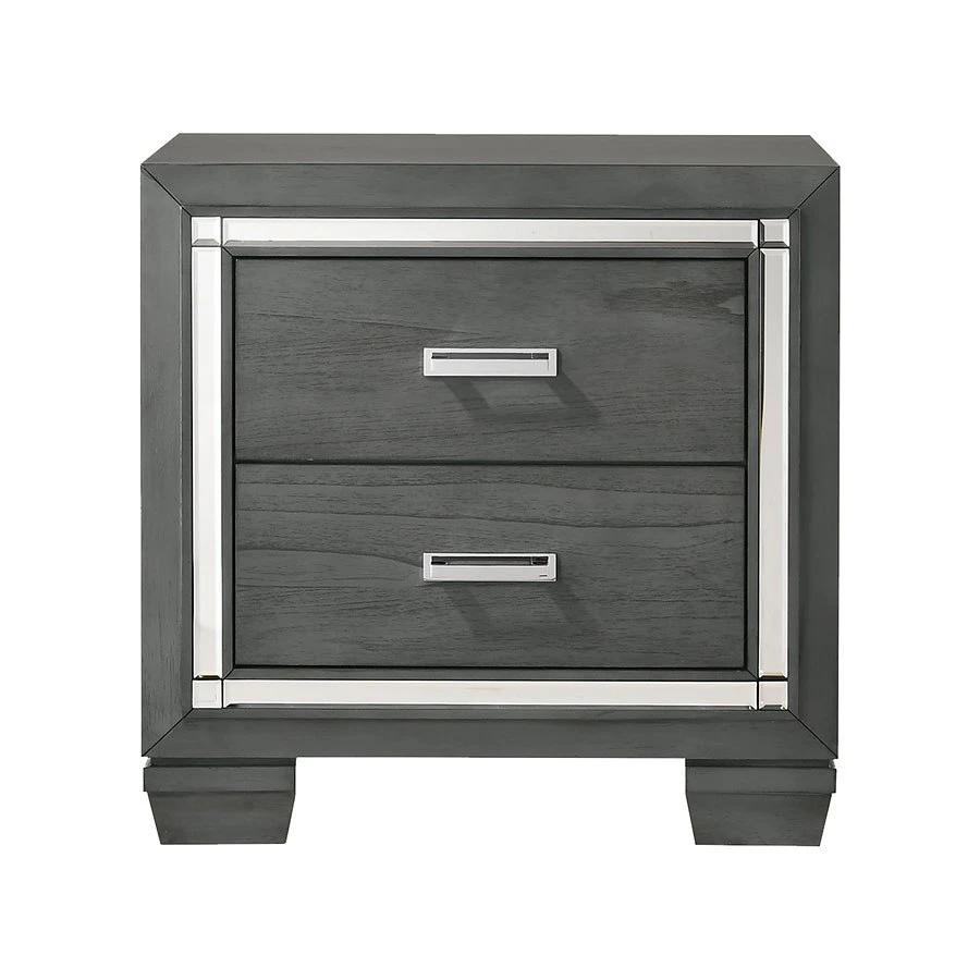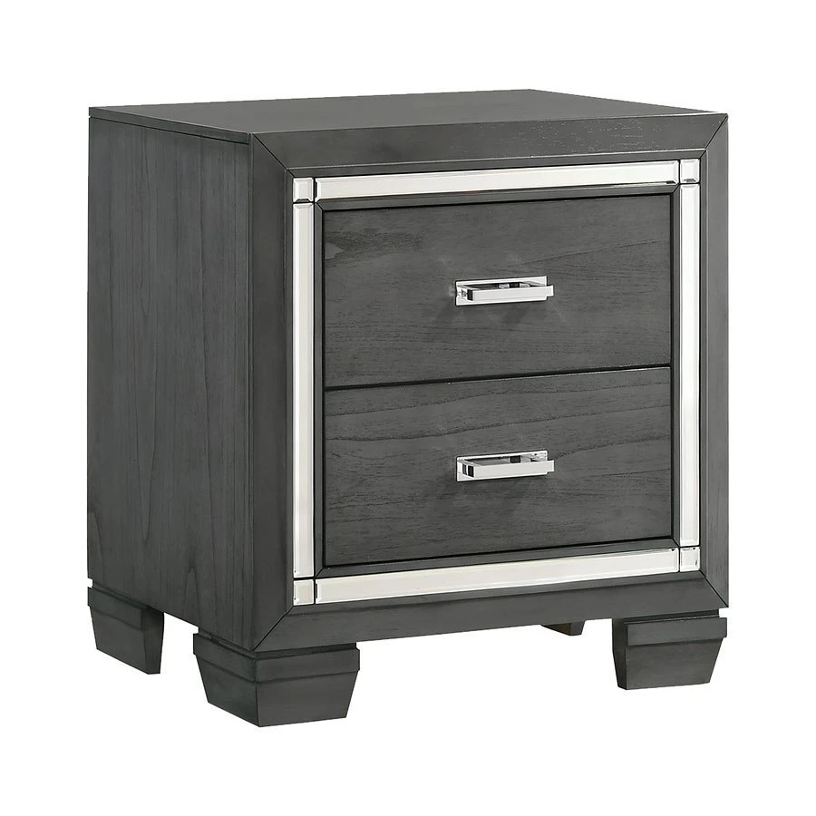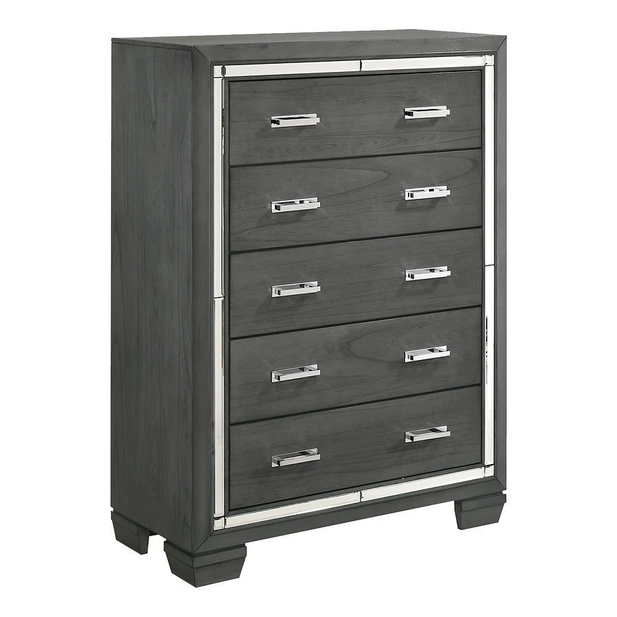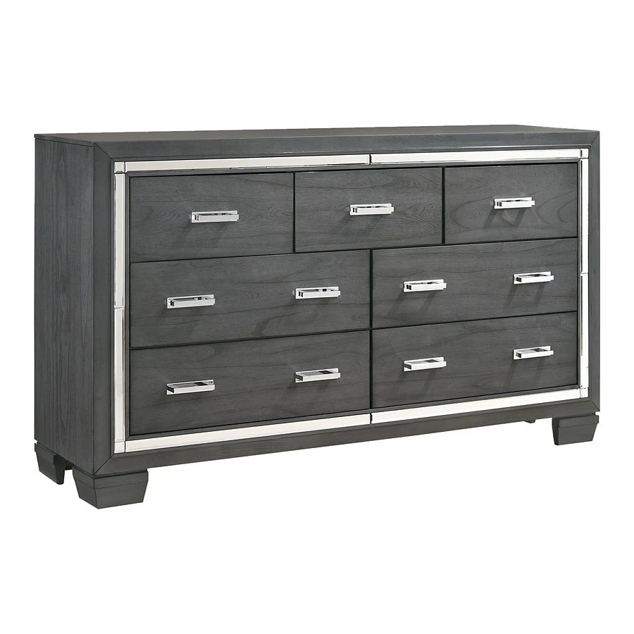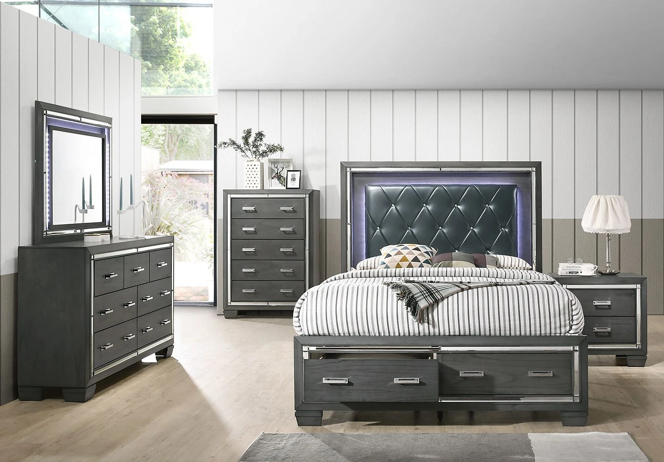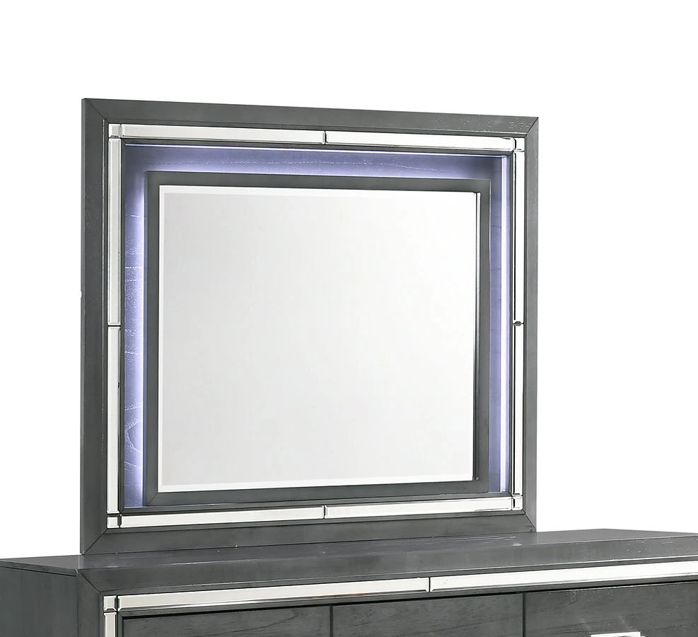 - OverviewElegant and eye-catching, the stunning Titanium Collection by Elements Furniture is the perfect addition to any space. The sophisticated Titanium Collection by Elements Furniture features a smoky gray finish paired with chrome handles and mirror trim. The headboard and mirror are equipped with a chic lighting feature. A faux leather upholstered headboard completes the look of this stylish set while convenient storage drawers in the footboard provides extra space to help keep you organized.