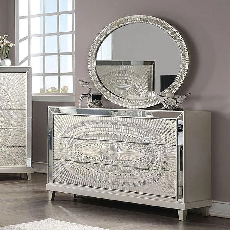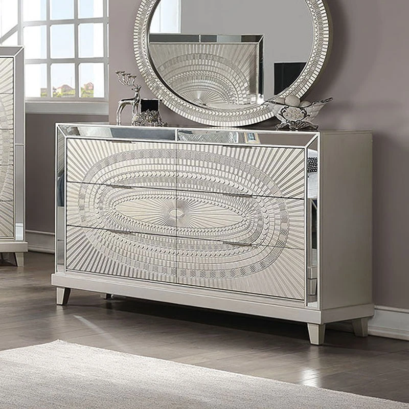 - OverviewGracing the panels of this Valletta dresser by Furniture of America is an intricate play of radial and circular lines, engraved in polyresin material. Your eyes are drawn towards this beautiful pattern reminiscent of the art deco era. Mirror panels line each front edge, adding to the luxurious appeal. On top of that, the classy champagne finish exudes subtle warmth that makes this dresser, even in its grandeur, still plenty welcoming.