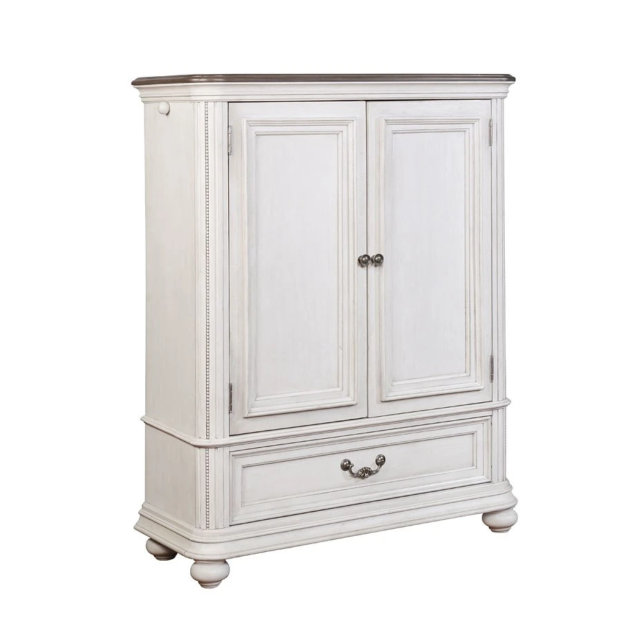 - OverviewThe beautiful traditional elegance of West Chester provides style and function to grace your bedroom. Constructed of Poplar solids with Birch veneers on front and sides and Oak Veneers on case tops with solid wood edges. The collection tops are finished in Weathered Oak and the bases in a rub-through White allowing its design to be combined using many popular color schemes. Eye-catching Antique Bronze hardware adorns drawers, while arches, scrolls, carved keystones, canted fluted corners all serve to enhance the experience of this sophisticated look.