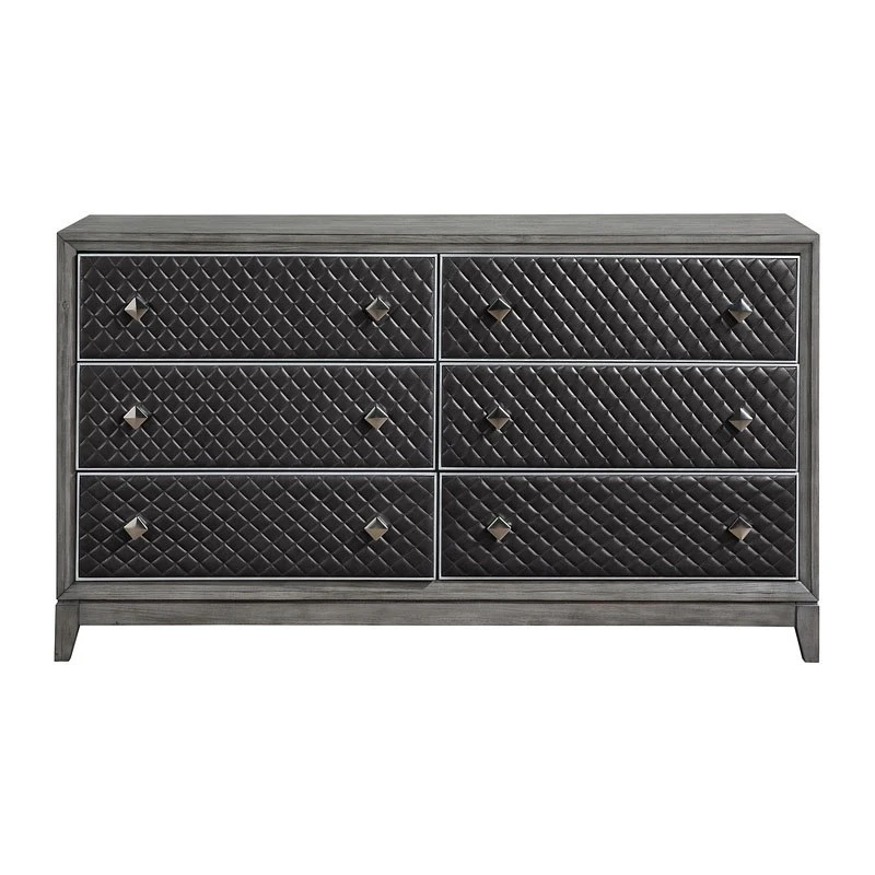 Painted silver accent subtly frames the diamond-patterned gray faux leather fronts