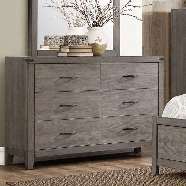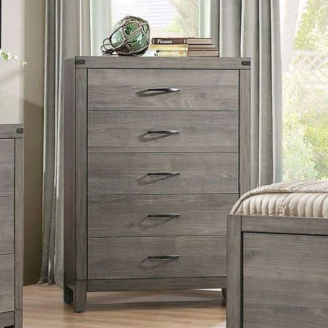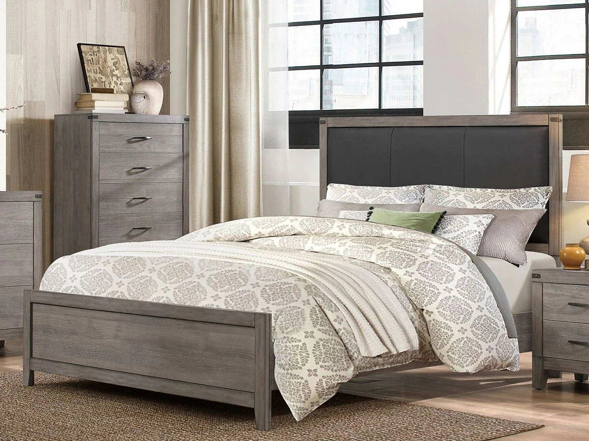 - OverviewIndustrial design is subtly used to achieve a cool look for your bedroom in the Woodrow Collection by Homelegance. Dark metal hardware and corner banding with rivet look lend to the casual look of this bedroom group. Melamine laminate features a weathered-wood look that furthers the intended design. Black bi-cast vinyl accents of the headboard provides distinct complementing contrast to the finish of the collection.